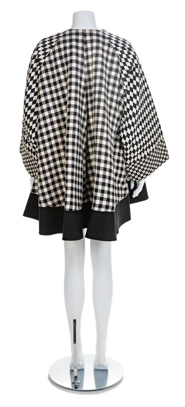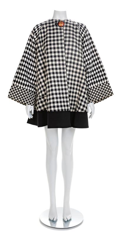 The main body of the swing coat is padded and made of black and white plaid wool with black and white printed silk sleeves and cuffs. The coat is hemmed with top-stitched black silk. The lining of the coat is a multicolored pattern woven with gold thread, with a different printed silk for the sleeve lining. One large goldtone and enamel button and hand-sewn buttonhole at the neck.