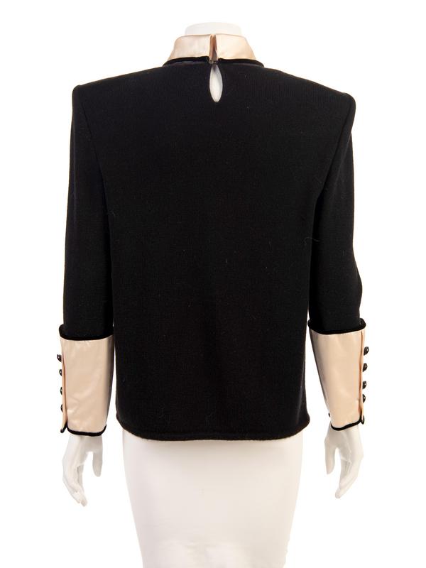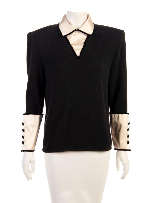 THE THIRD: A black knit trimmed top with white satin around collar and sleeve hem. The white satin collar is detachable with snaps.