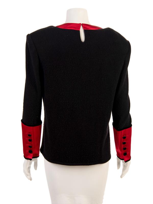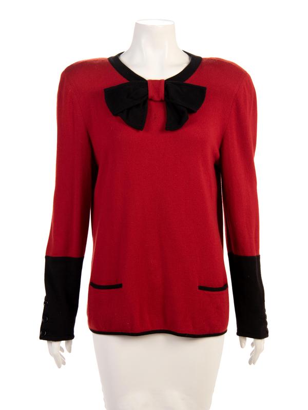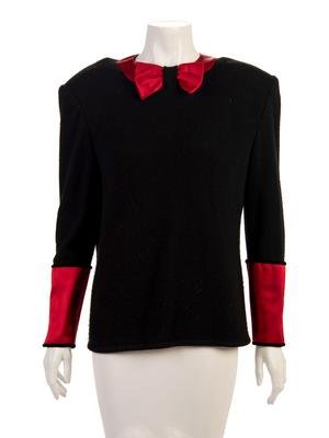 THE SECOND: A black knit cashmere and red silk satin top with a red silk satin bow at center front neckline.