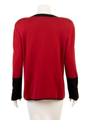 THE FIRST: A red black knit top with a black knit bow at neckline and three button sleeve cuff.