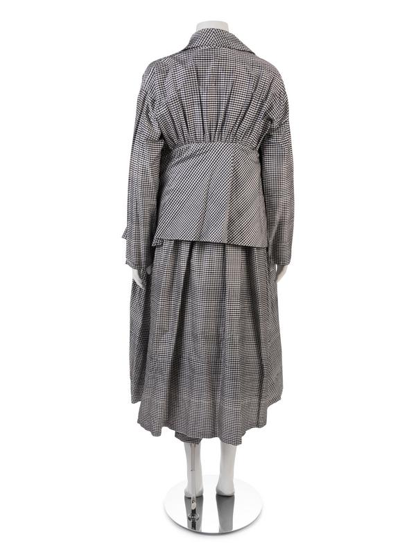 A blue and white plaid jacket and pants. Clutch jacket is made with a gathered center back at waistline with a wide peplum, long sleeves and no closure. Pants made of self fabric.