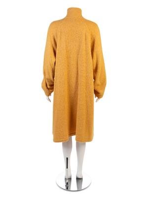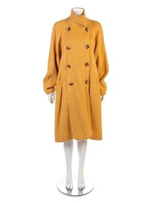 Long yellow and white knit wool coat with raglan sleeves, quilted stand collar, and center front button closure.