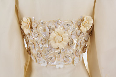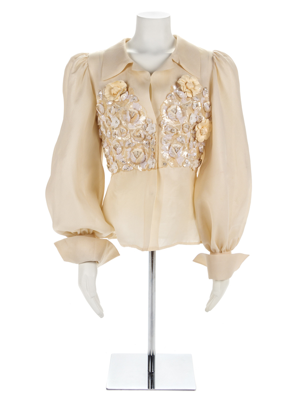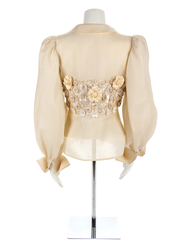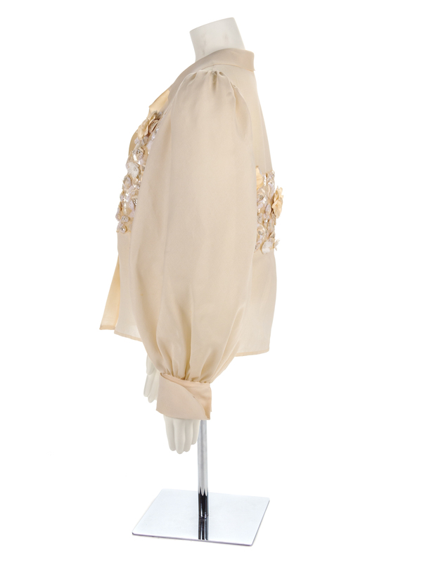 Sheer off-white fabric with a richly embroidered panel of raised flowers and fauna in sequins, beads and fabric that extend around the body. The blouse is cut with very full sleeves gathered into a wide French cuff, a notched collar and a center front snap closure.