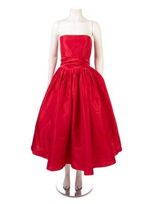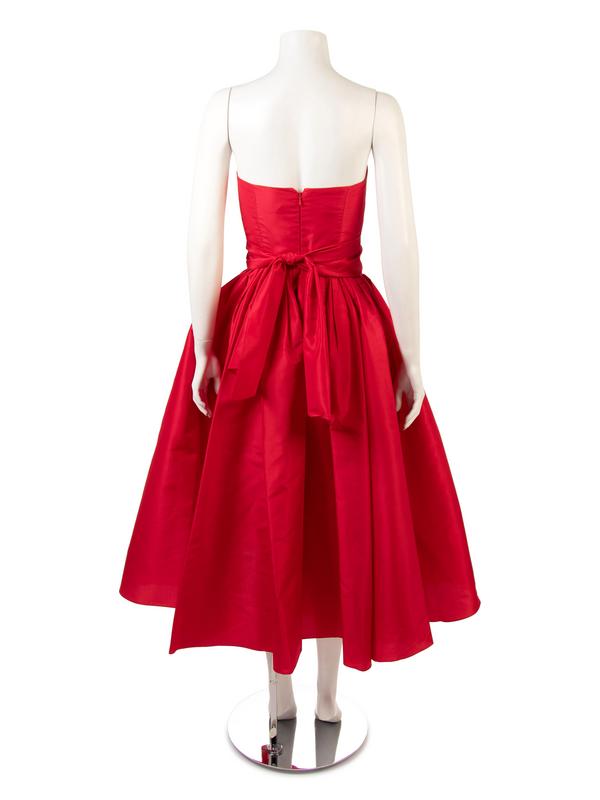 Strapless red dress of silk taffeta pleated into the waistline and comes with a self-fabric belt.