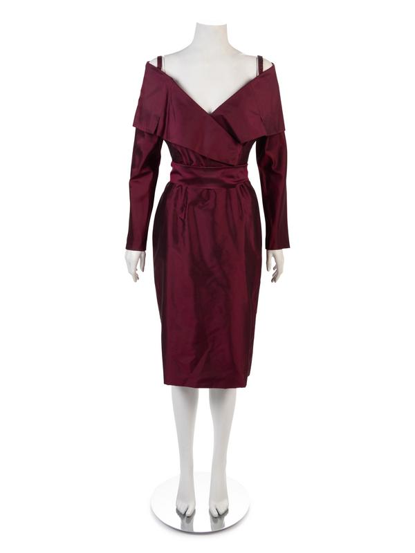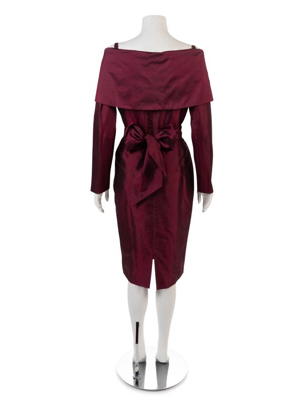 Burgundy silk taffeta dress with off the shoulder neckline, long sleeves, straight skirt, and a separate self-fabric skirt.