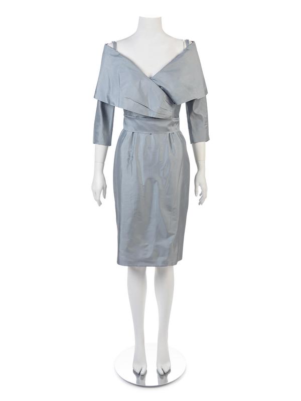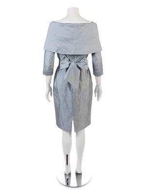 Blue silk taffeta dress with off the shoulder neckline, long sleeves, straight skirt, and a separate self-fabric skirt.