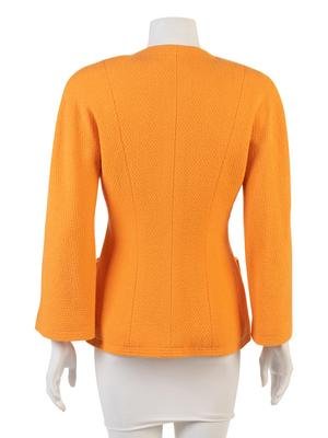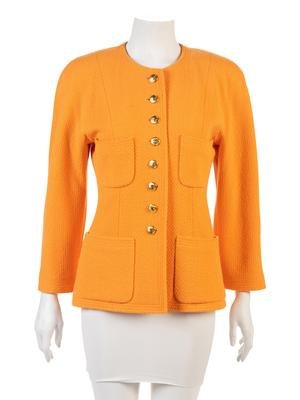 An orange wool boucle jacket with scoop neckline, ragland sleeves, four patch pockets, and a gold tone cc button closure.