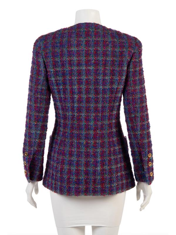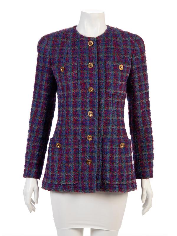 A blue purple and red plaid wool-blend jacket with four patch pockets, long sleeves, and finished with "Chanel Paris" gold-tone buttons down center front, on each pocket, and cuff hems.