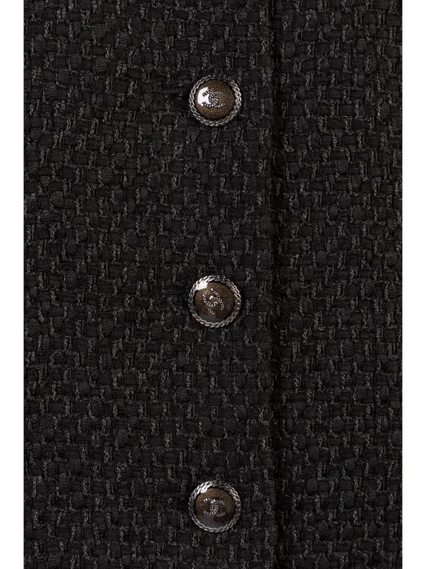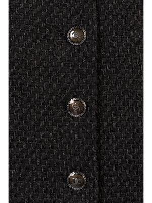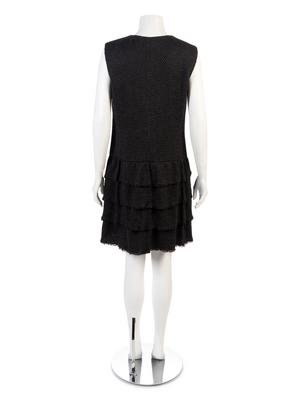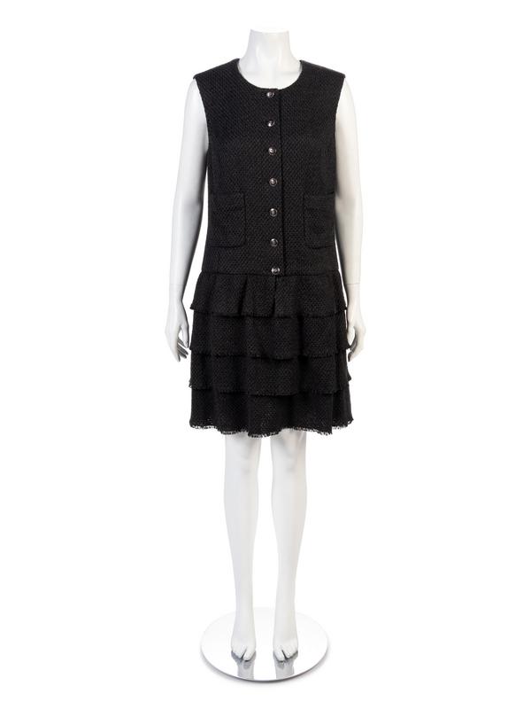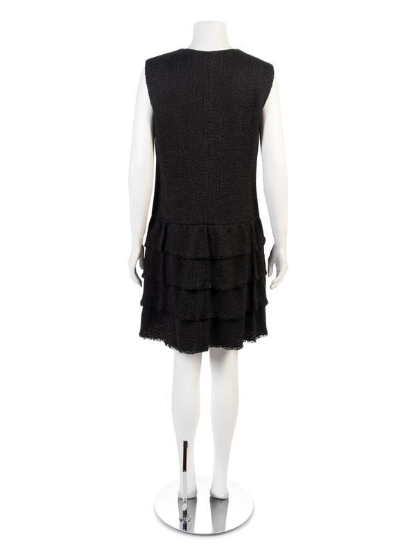 Strapless black cotton blend boucle dress with a four-tier peplum skirt and center front CC button closure.