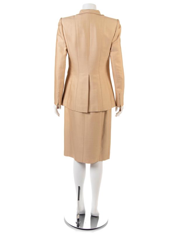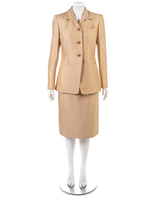 A tan Hermès skirt suit with skirt and jacket. Jacket with pointed collar long sleeves with a zipper hem and a center front button closure. Center front buttons made of wood that is etched with the letter H. Straight skirt gathered into a thin waistband.