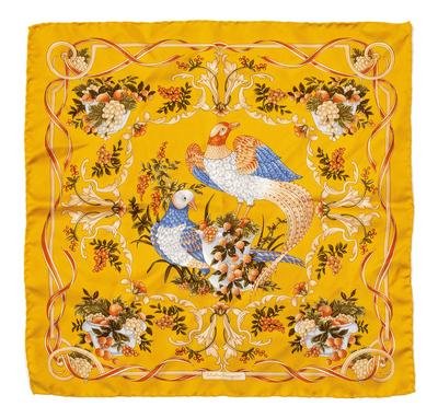 Printed yellow silk scarf with scene of birds and flora.