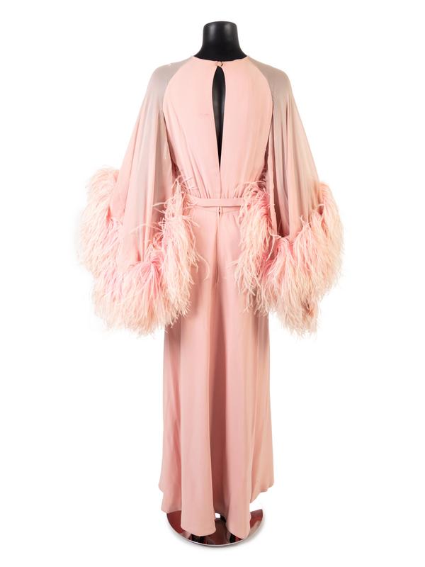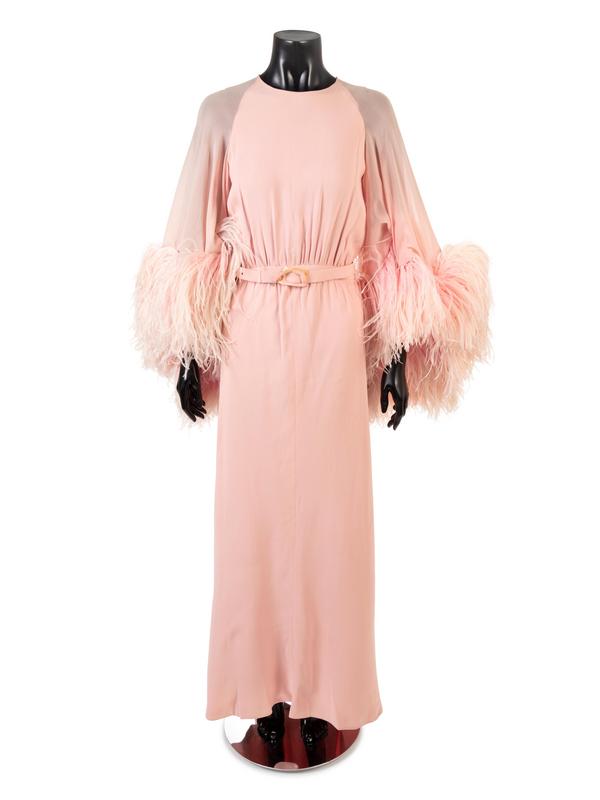 Soft pink silk crepe evening dress with flared sleeves trimmed in soft pink ostrich feathers and self-fabric belt.