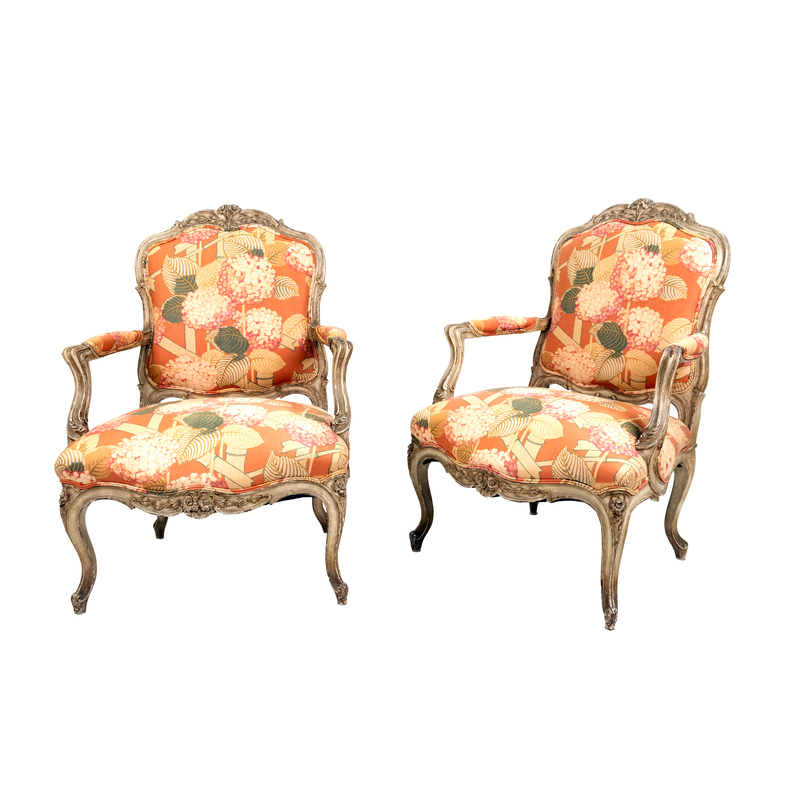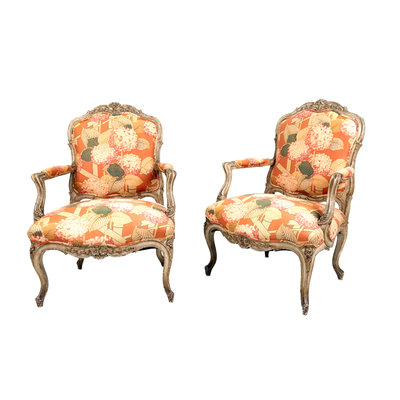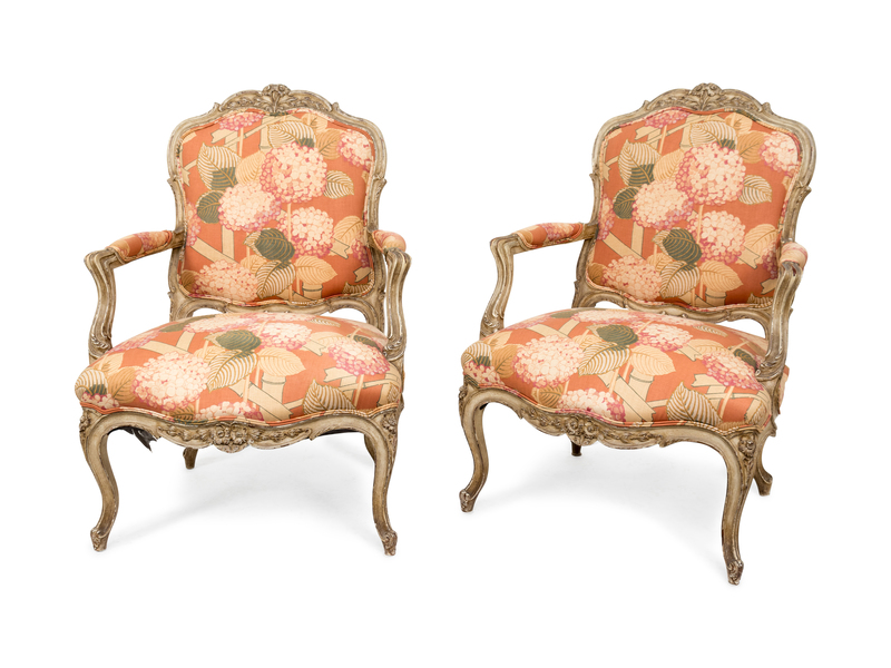 A Pair of Louis XV Style Carved and Painted Fauteuils