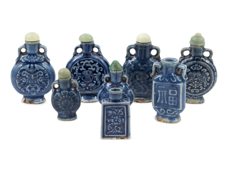 A Group of Chinese Blue Glazed Moonflask Form Snuff Bottles