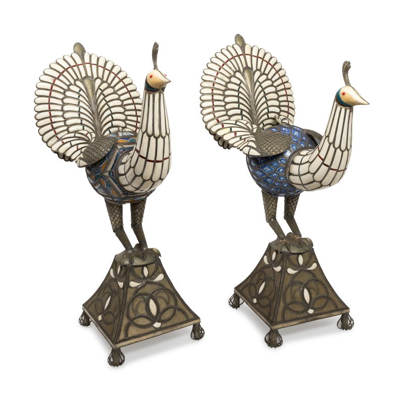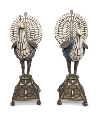 A Pair of Middle Eastern Inlaid Silvered Metal and Porcelain Models of Peacocks