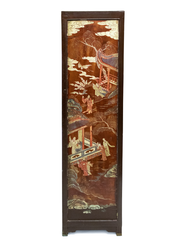 A Pair of Chinese Two-Door Brown Lacquered Cabinets with Polychromed Inset Panels