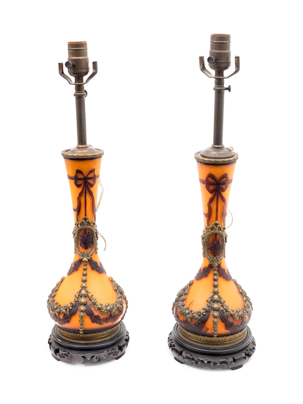 A Pair of French Signed Abel Combe Cameo Glass Vases with Gilt Metal Mounts