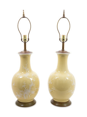 having overlaid white decoration of birds in flight and flowering tree branches; now mounted as lamps.