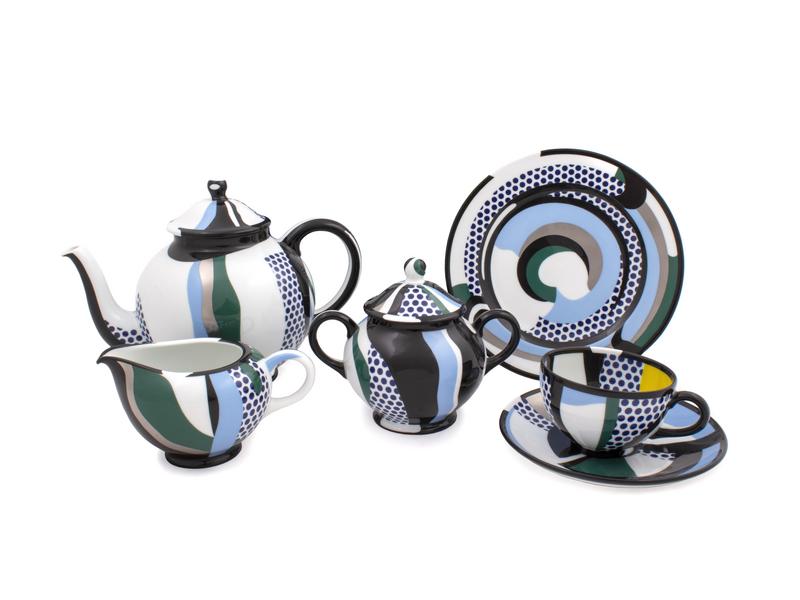 stamped signature and numbered 5/100; comprising 6 teacups and saucers, six biscuit plates, a teapot, creamer and sugar; in original box