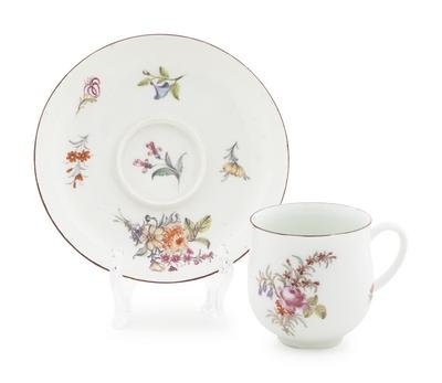 raised center rim on saucer, sprig flower decoration, line rim; red anchor mark.
