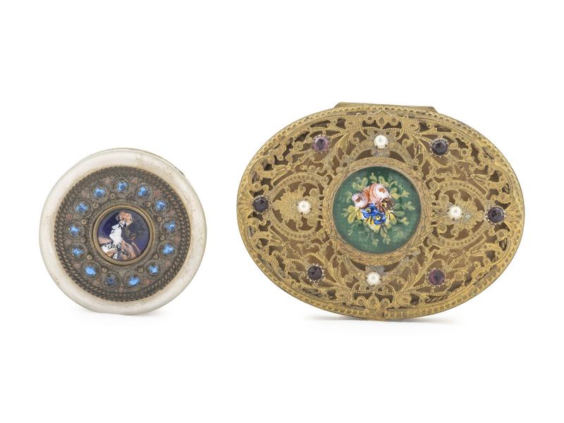 comprising a gilt metal oval compact, the other mother-of-pearl, the lid inset with enameled portrait roundel of woman and blue faceted stones.