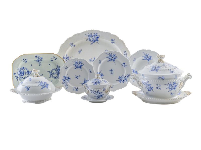 comprising 12 soup bowls, 23 dinner plates, 12 dessert plates, 2 lidded sauce tureens with undertrays, one extra undertray, 3 covered serving bowls, 1 large tureen with undertray, one rectangular serving platter with canted corners, a well-and-tree platter and another large platter, L: 20"
