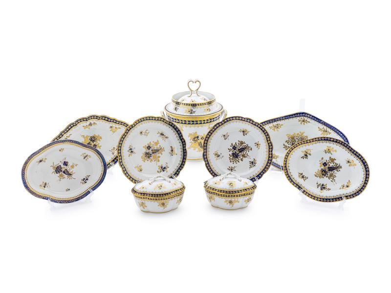 blue S mark; comprising an ice pail with liner and cover, two covered sauce tureens, four oval dishes, a large oval bowl and ten plates.