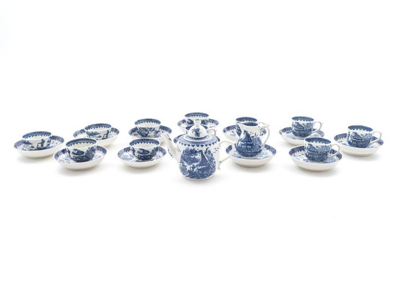 in the Fisherman pattern, comprising a teapot, creamer, 6 tea bowls, 5 coffee cans and 12 saucers; open crescent mark.