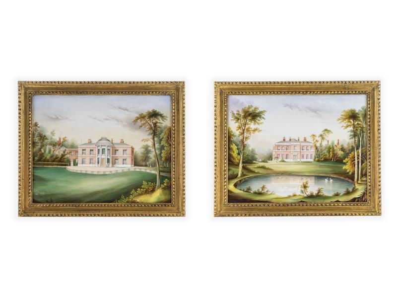 a pair of architectural landscapes with the front and back of a stately home; in gilt frames.
