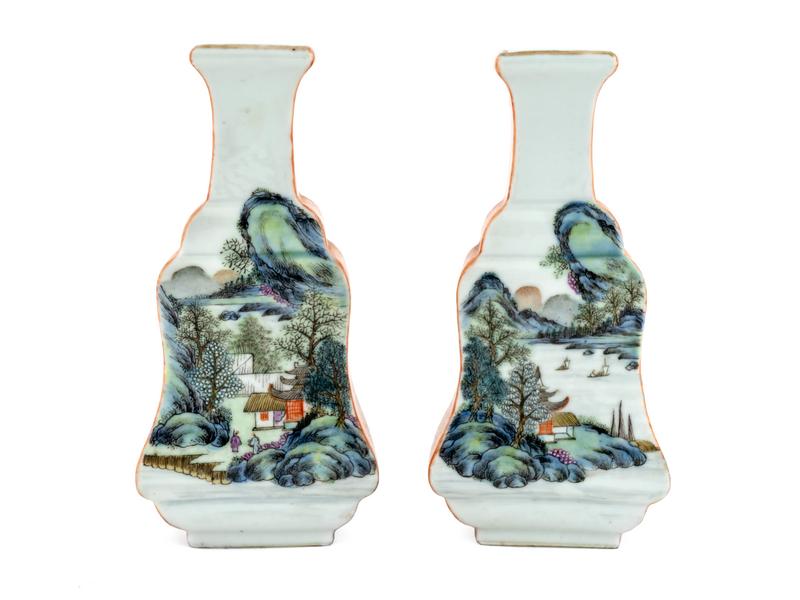 A Pair of Chinese Faux Bois and Famille Rose Porcelain Vases
