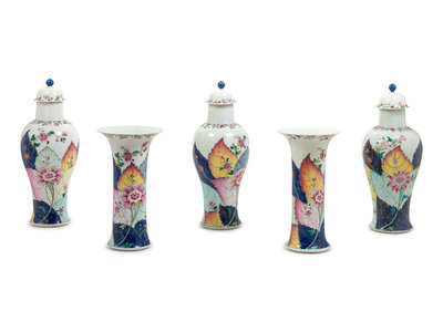 A Chinese Export Five-Piece Tobacco Leaf Porcelain Garniture