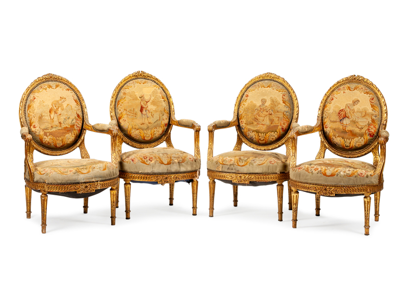 A Set of Four Louis XVI Style Aubusson Tapestry Upholstered Giltwood Fauteuils