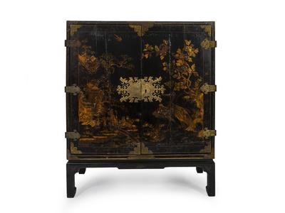 A William & Mary Black and Gilt Japanned Cabinet on Later Stand