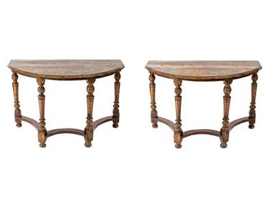 A Pair of Jacobean Style Carved Walnut Demilune Console Tables