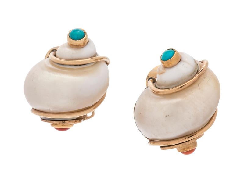 Containing two shells within yellow gold wirework accented with two round cabochon cut turquoise and two round cabochon cut coral. Mounted in yellow gold.