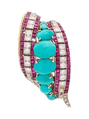 TURQUOISE, DIAMOND AND RUBY BROOCH