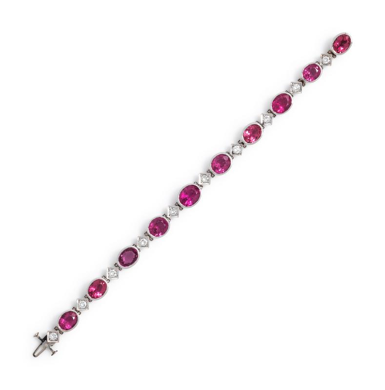 Containing 10 oval mixed cut tourmaline measuring approximately 8.35 x 6.50-10.00 x 8.00 mm and 10 round brilliant cut diamonds weighing approximately 1.50 carats total. Mounted in white gold.