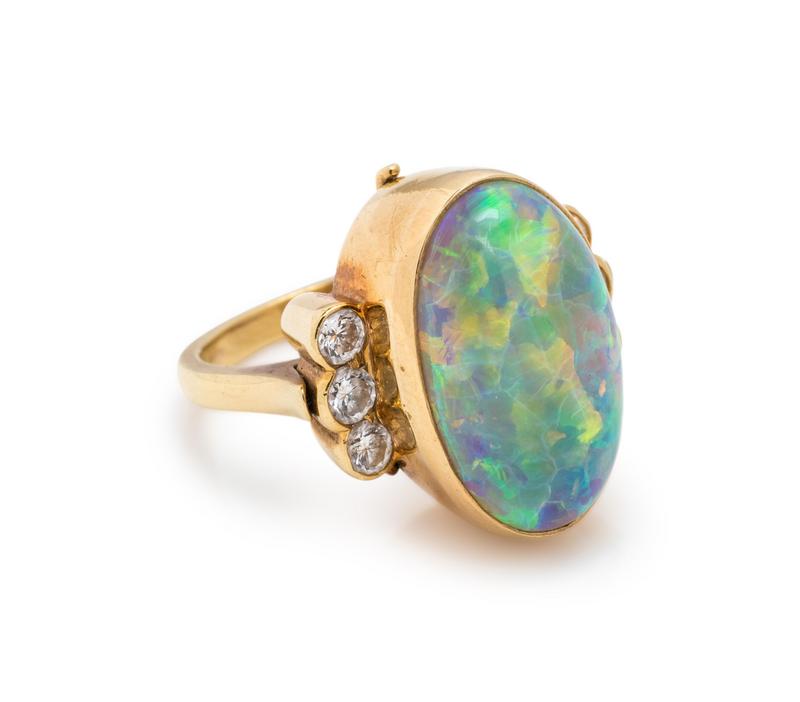 Containing one oval cabochon cut opal measuring approximately 19.26 x 12.00 mm and six round brilliant cut diamonds weighing approximately 0.45 carat total, with removable ring shank. Mounted in yellow gold.