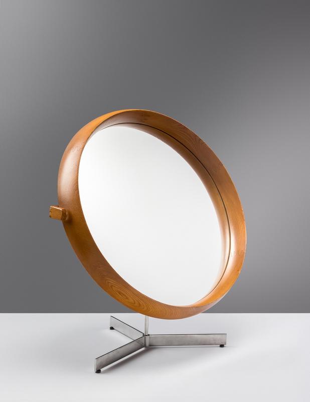 teak, mirrored glass, matte chrome-plated steel, stainless steel