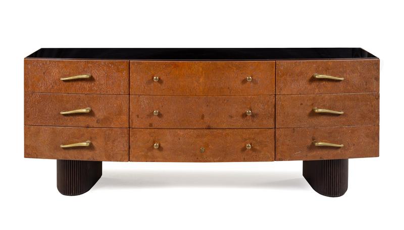 lacquered burlwood, reverse-painted glass, brass
