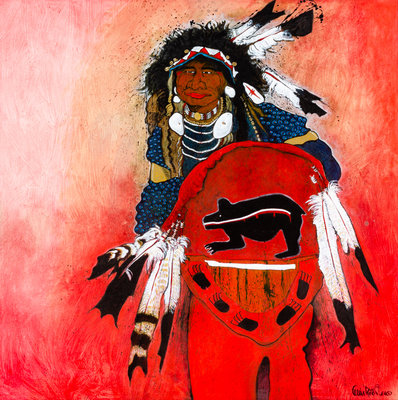 Bad Bear and His Medicine Shield, 1989, oil on canvas, signed Kevin Red Star (lower right)