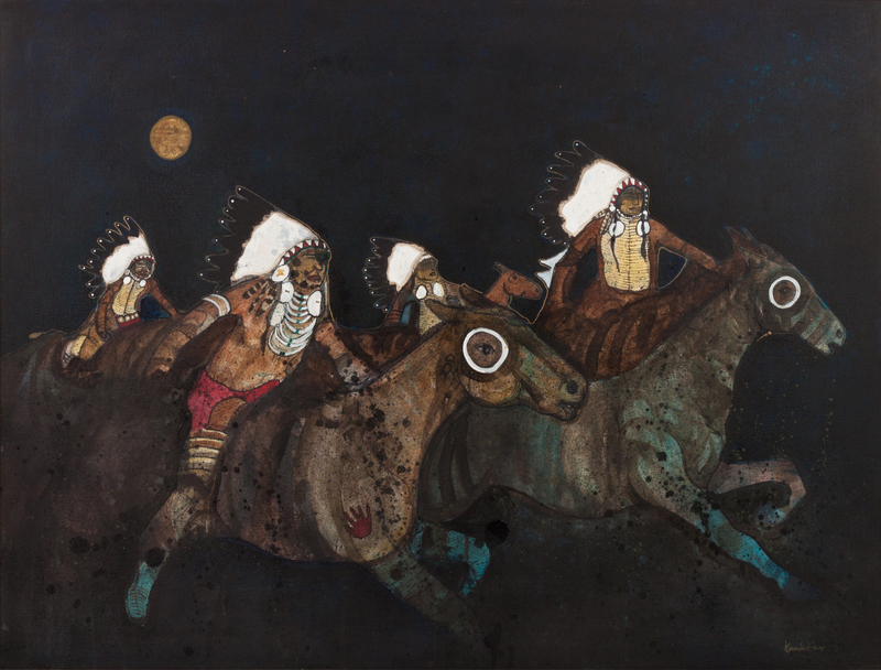 Indian Horse Raid, oil on canvas, signed Kevin Red Star (lower right)