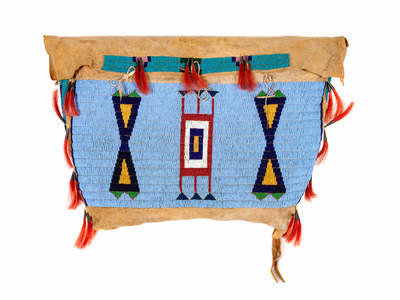 sinew-sewn and beaded using colors of light blue, cobalt, red white-heart, greasy yellow, white, and translucent green; tin cones with red dyed horse hair