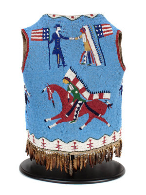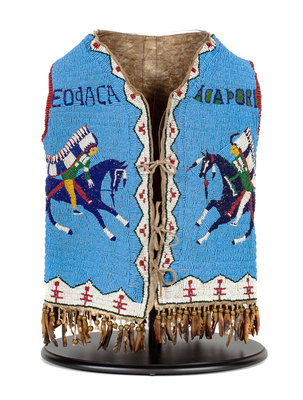 thread and sinew-sewn using colors of light blue, faceted dark blue, red white-heart, pea green, greasy yellow, and white; trimmed with brass beads and dew claw recycled from a Grass Dance bandolier; imagery of a warrior on horseback and the greeting of a US statesman and warrior on back; front with two warriors on horseback and Eodaca Acapori on shoulders; lower border depicts dragonflies