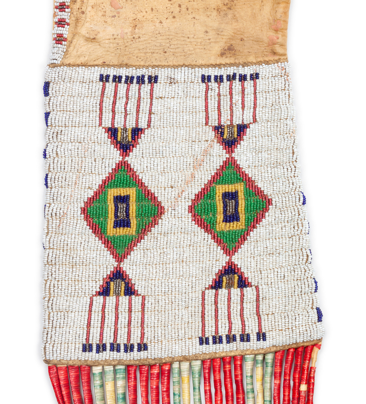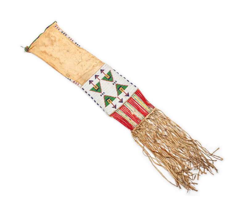 sinew-sewn and beaded on softly tanned hide using colors of white, red white-heart, greasy yellow, pea green, cobalt, and metallic; thin, quill-wrapped rawhide slats