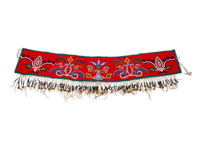 thread-sewn red wool; with curvilinear floral beadwork in colors of pony trader blue, cobalt, greens, white, greasy yellow, and clear; hide fringe strung with basket beads with brass bells; canvas backed