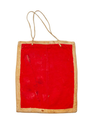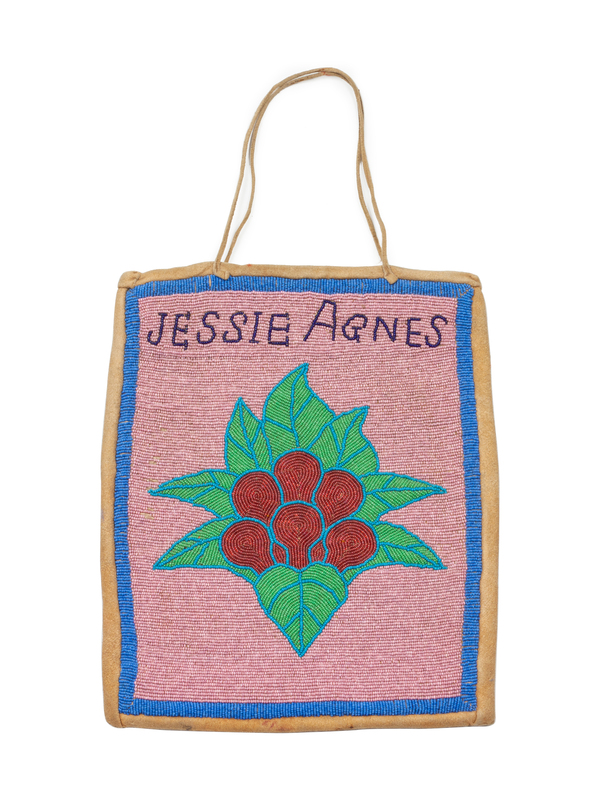 thread-sewn and beaded in pink, periwinkle, rose, cobalt, and light blue; Jessie Agnes integrated into design; lined with patterned cotton