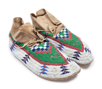 sinew-sewn and beaded in colors of white, light blue, cobalt, red white-heart, pea green, and metallic; angled cuff; interior of cuff inked E. Fishbaugh