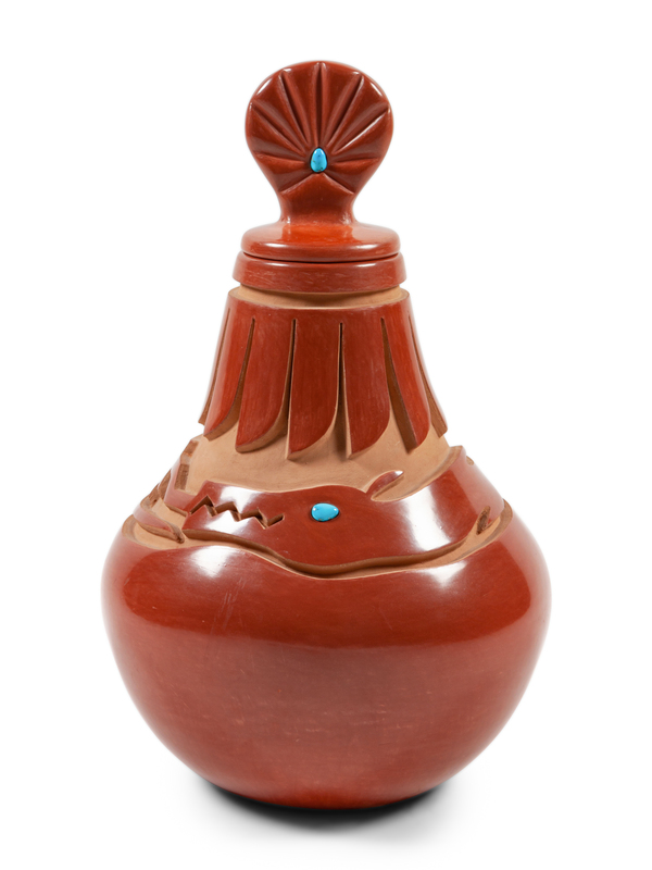 Carved Redware Jar with Lid and Turquoise