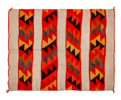 woven of thick, hand-spun wool in colors of orange, yellow, blue, black, and cream